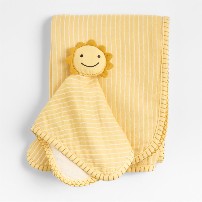 The forecast is always warm and sunny with this gift set. Made of 100% organic cotton gauze, the lovey and stroller blanket are both gentle on baby's delicate skin and cozy to cuddle with on the go. In a subtly striped yellow, the pieces coordinate with a variety of our crib bedding collections.