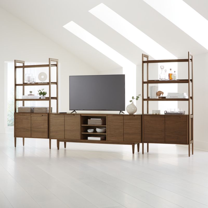 Our 1960s-inspired Tate collection recalls the timelessness of mid-century design with a tailored profile and streamlined shape that works well in any room. Flanked by clean-lined bookcase cabinets, the media console offers additional storage space behind smoothly sliding drawers.
