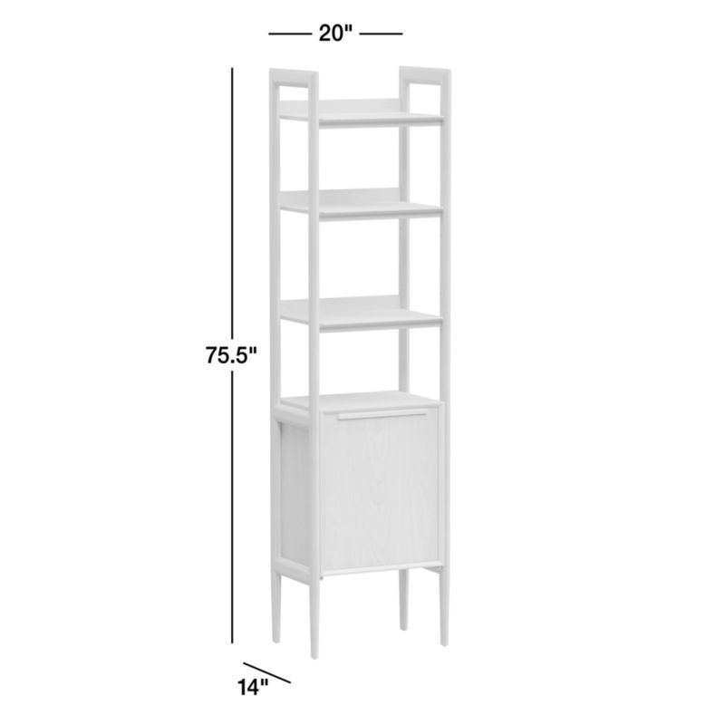 Designed to complement our Tate sink vanities, this wood storage tower rises high to host towels, toiletries and other bathroom essentials. An open frame and slim legs keep the look airy despite the wealth of storage offered by three shelves and a roomy cabinet with an adjustable interior shelf. The sleek, mid-century-inspired design showcases the gorgeous grain of walnut veneer with a touch of retro in the horizontal pull and beveled molding.