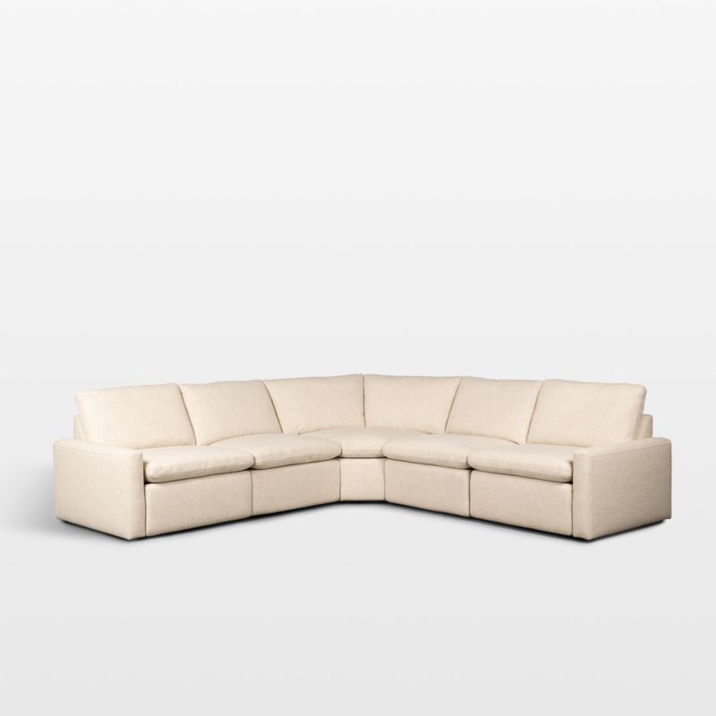All the comfort of traditional recliners with clean, updated styling. the Tillery power recliner sectional relaxes with slightly higher seats and backrests, low track arms and motion footrests that adjust with out-of-view control buttons. Loose seat and back cushions filled with a plush fiber-feather mix contribute to the comfy look and feel. The off-white performance fabric upholstery withstands spills, traffic and wear for unmatched durability with the look of linen. Feel free to position the five-piece sectional sofa—reclining left- and right-arm and armless chairs with stationary corner and armless chairs—against the wall as the zero-clearance design allows you to recline without restriction.
