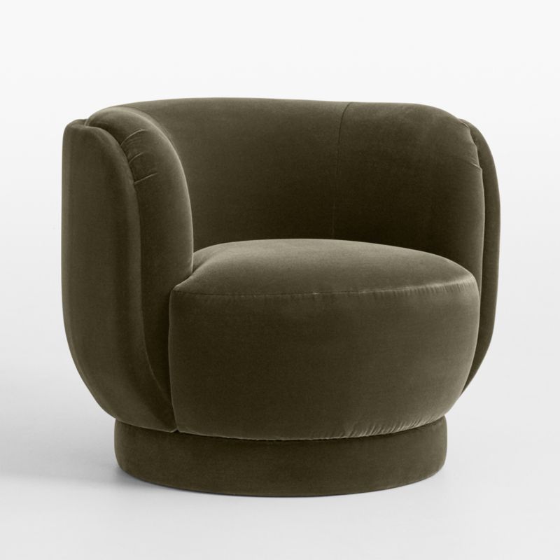 Upholstered from top to bottom in a velvety mohair-like fabric in deep green, Vera beckons with cuddle-up softness and comforting curves. The tight-tailored chair wraps an outer shell into a barrel curve that embraces a plush interior back cushion. The substantial seat cushion sits medium-firm and a little petite, with a swivel base for a 360-degree sweep of the room. We love Vera in pairs as an instant room upgrade with lasting impact and value.