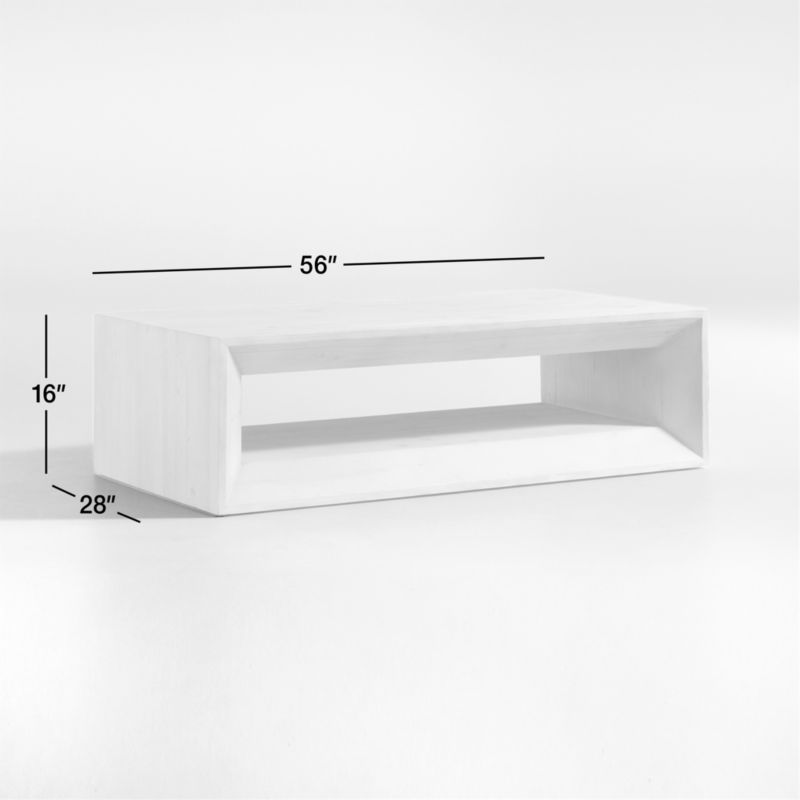 Like a picture frame, our Vernon coffee table uses mitered corners and angles to bring focus to the beauty of natural wood and pure lines. Made of pine with a lightly bleached finish, the rectangular coffee table uses a reverse bevel edge to wrap the waterfall frame and lead the eye to its single open shelf. Light wirebrushing lends texture while highlighting the wood's cathedral and quarter-sawn graining. The Vernon natural coffee table is a Crate & Barrel exclusive.