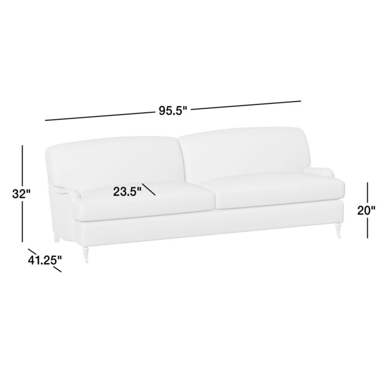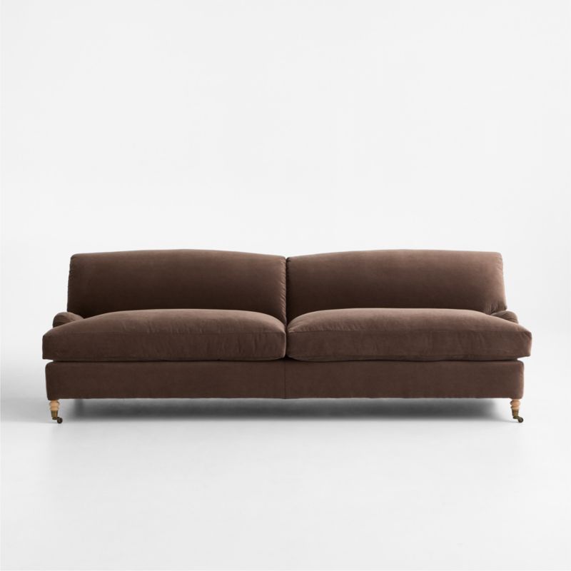 Expertly crafted and extravagantly plush Whitby invites you to sit back and relax. Exuding the charm of a traditional English roll-arm sofa, this generously proportioned classic indulges with loose seat cushions lofted with a plush feather-down blend to sit deep and soft. Turned hardwood front legs with antique brass casters add to the sofa's heirloom aesthetic. Meticulous attention to detail includes D-rings to hold the seat cushions in place, coil suspension in the back and eight-way, hand-tied seat suspension—the gold standard for lasting comfort and support. Covered in luxe velvet, the sofa abounds with timeless style and exceptional quality.