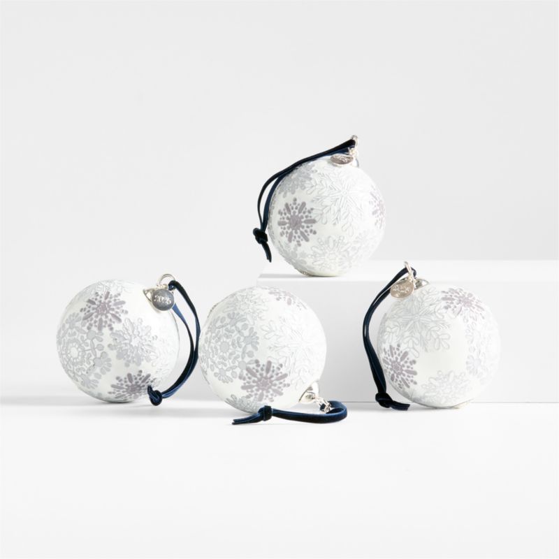 Inspired by the art of cloisonne—designs made out of colored enamel delineated with copper wires—our ornaments boast the same intricate details in a minimalist wintry palette. Skilled artisans paint the metal spheres white, meticulously outlining the silver snowflakes in textural glitter. These four gorgeous ornaments suit monochromatic white Christmas trees and formal trees decorated with Old World glamour.